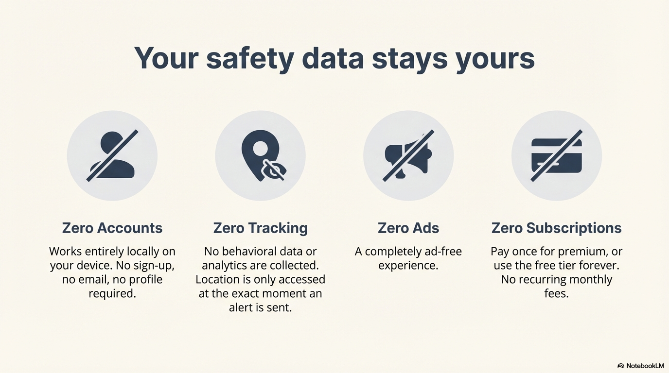Your safety data stays yours. No accounts, no tracking, no surveillance.