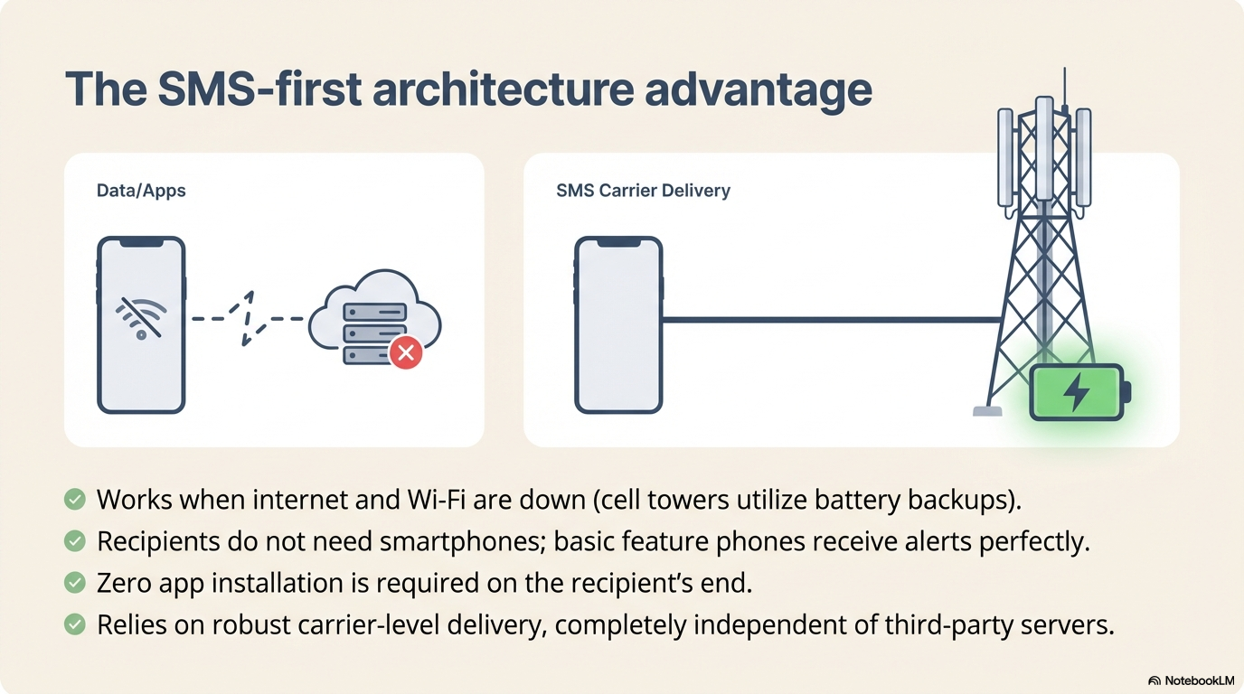 The app prioritizes SMS over data-based messaging (push notifications, WhatsApp, etc.) because: