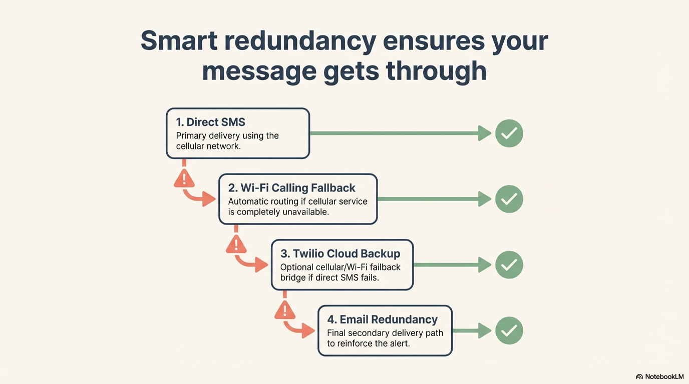 Smart Redundancy: When no cellular service is available, the app falls back to sending SMS first via Wi-Fi Calling (if available, phone/provider dependent) or, if not, via Twilio (if configured). This provides a secondary delivery path when the primary SMS channel is unavailable. Likewise, in a situation with only cellular service (no Wi-Fi and no internet), if the Direct SMS fails for some reason (defective or no SIM,...), Twilio (if configured) will act as failback, as it can also use the cellular network (via 4G/5G) to send the message as a last resort.