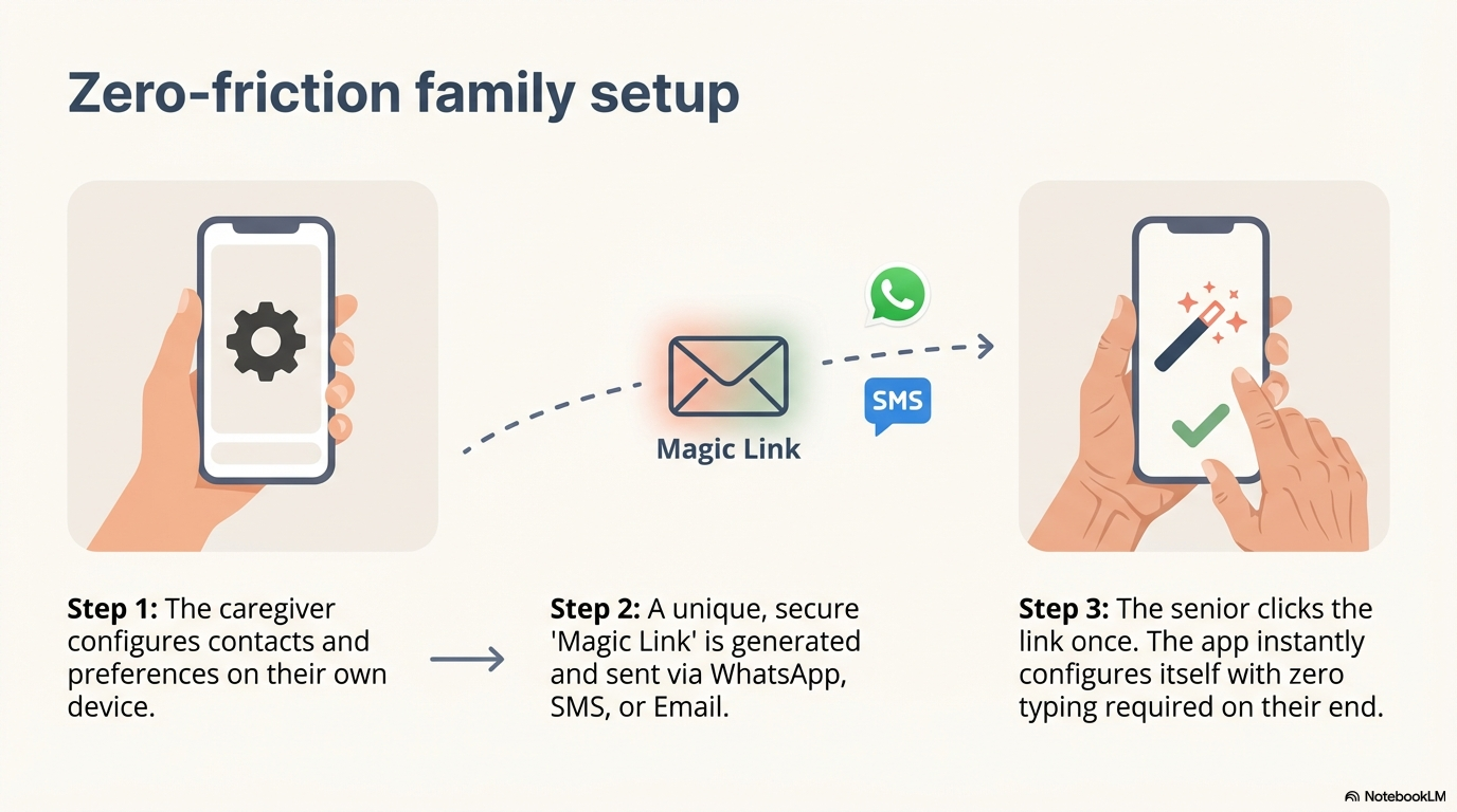 Set up SenyAlert for a senior using Magic Link — zero typing required for the senior.