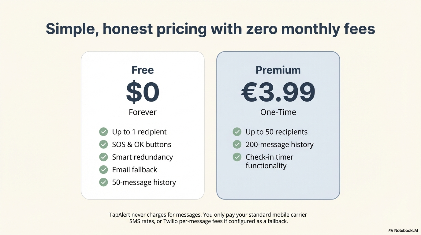 | Fully automatic Dead Man Timer | ✅ Yes | ❌ Only with Twilio (paid). Without Twilio, the Messages app opens and the user must tap Send |